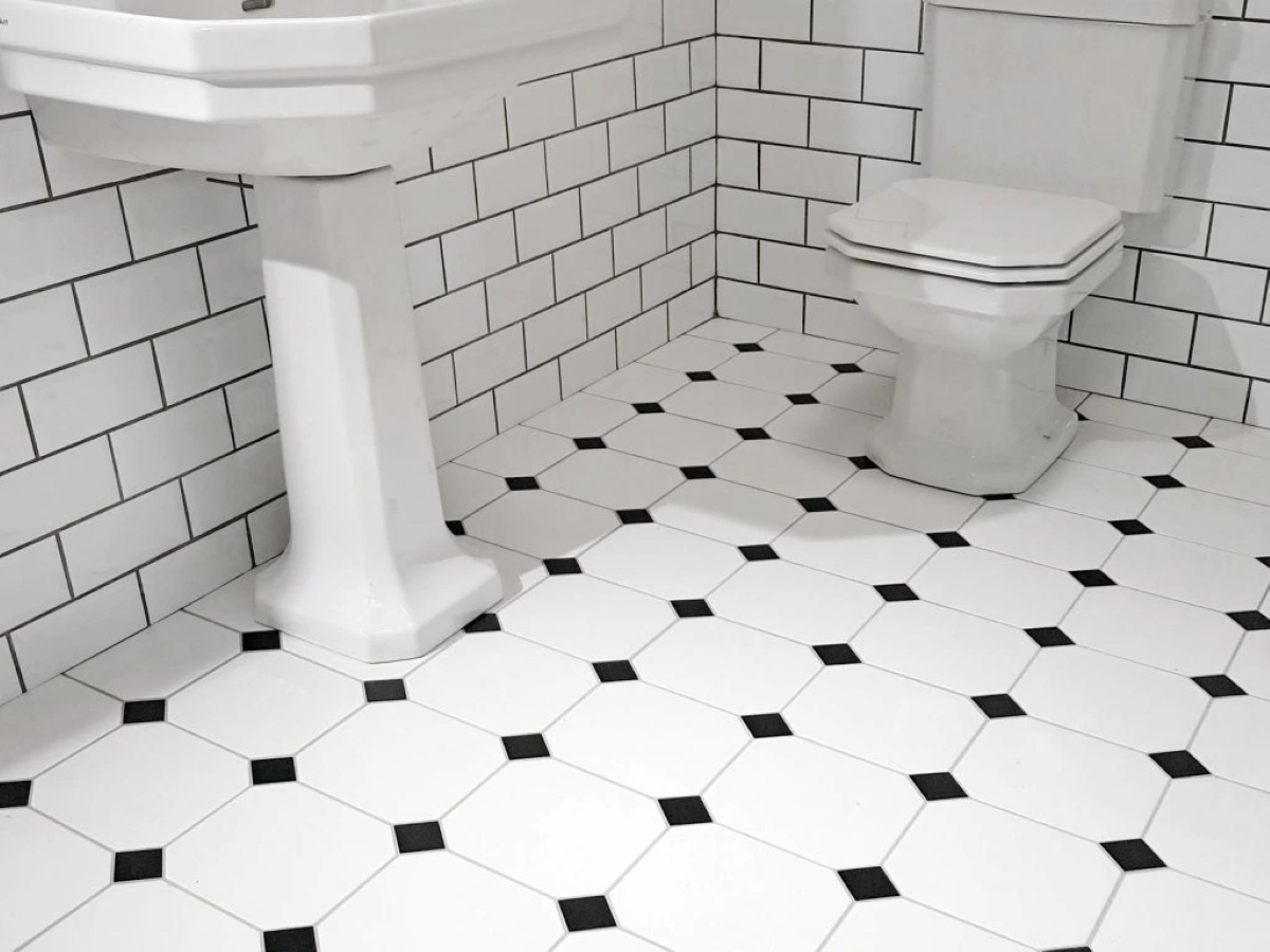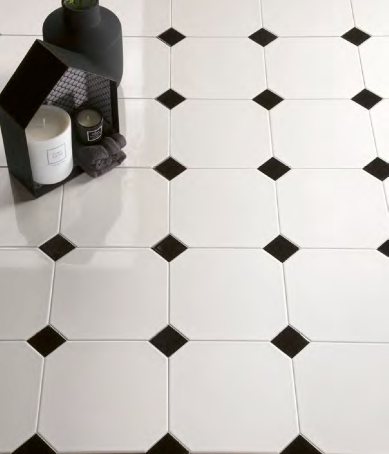 CE.SI. 20×20 cm OTTAGONO BIANCO on kaheksanurkne glasuuritud portselan-keraamiline plaat, mis paigaldatakse koos 5×5 cm nurgatükkidega.