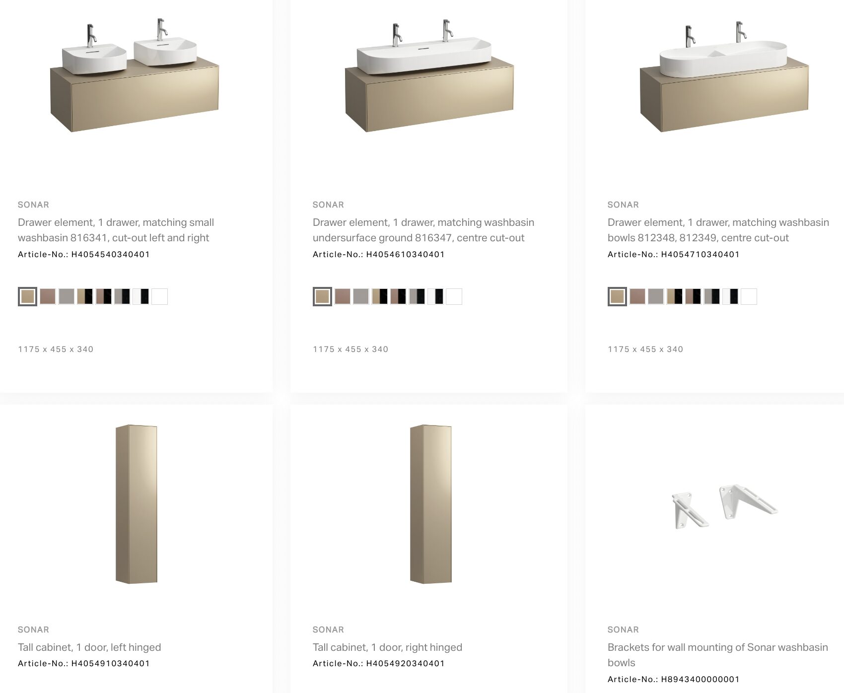 Sonar kollektsiooni kuuluvad valamud, vannitoamööbel, WC-potid, vannid.